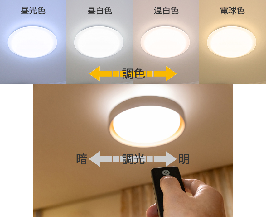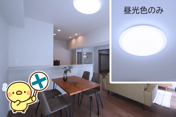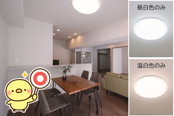 調光のみのLEDシーリングライトの場合には、「昼白色」がおすすめです。(「昼光色」は、事務所のようなイメージになってしまうため、おすすめしておりません。)