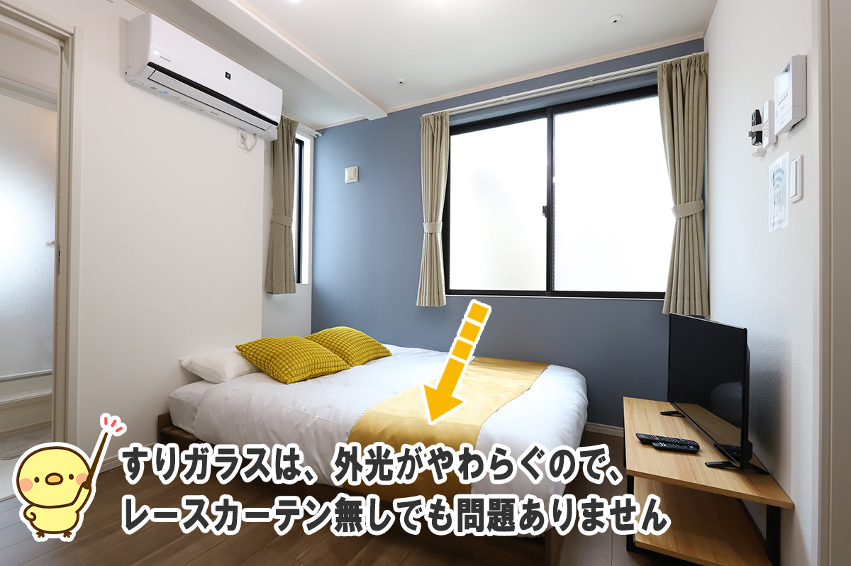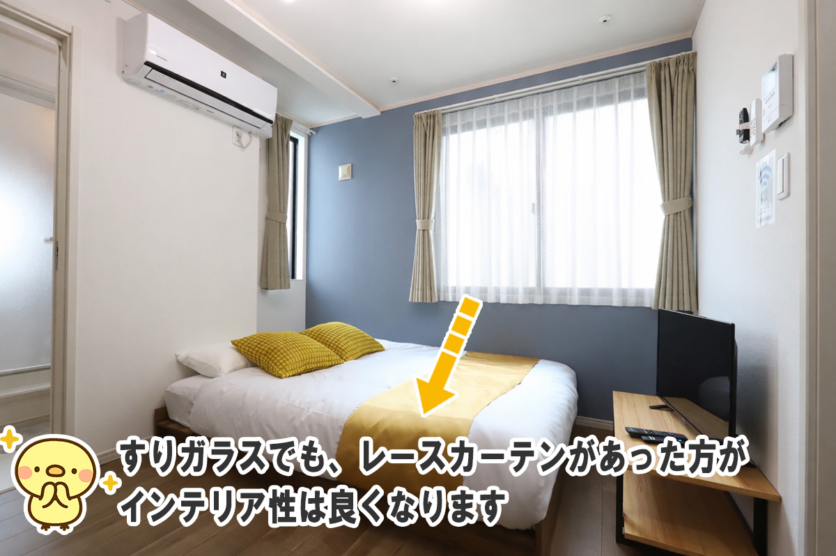 すりガラスが光をやわらげる役割を果たすので、レースカーテンは無くても問題ありません。ただし、レースカーテンの有り・無しで見た目の印象は変わります。